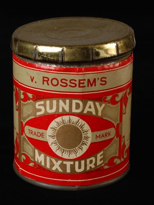 Geel met rood tabaksblik van Van Rossem, productnaam...