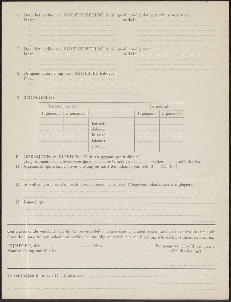 Vragenlijst oorlogsschade Nijmegen.
