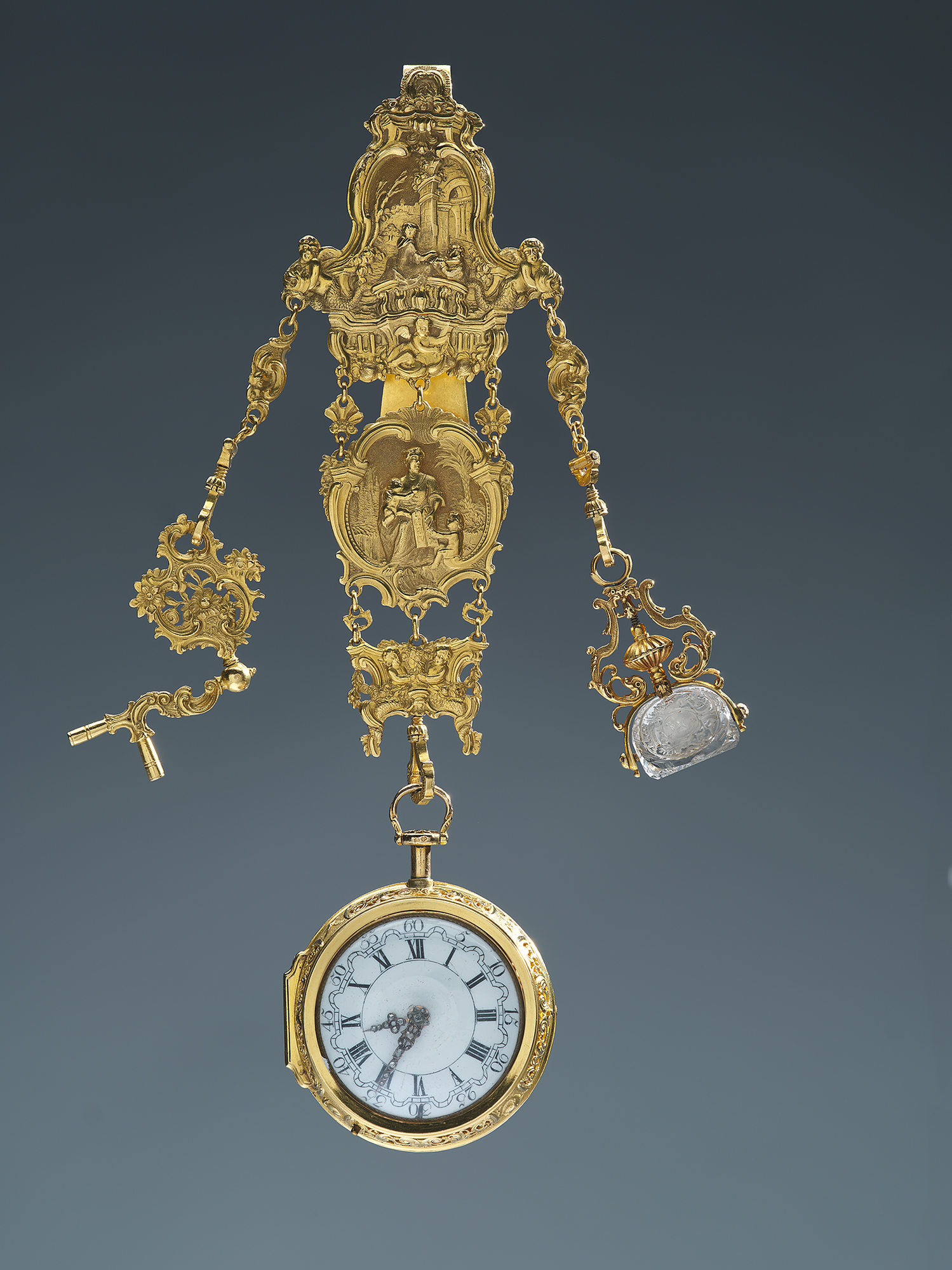 Horloge met binnen- en buitenkast aan chatelaine