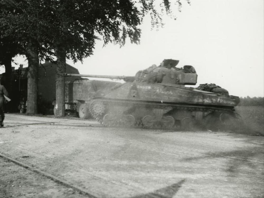 Foto Britse Sherman firefly tank draair de Rijksweg ...
