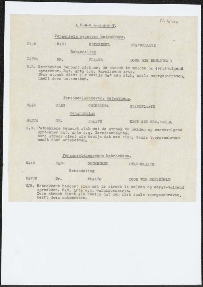 Afschrift van formuliertjes met personeelsgegevens b...