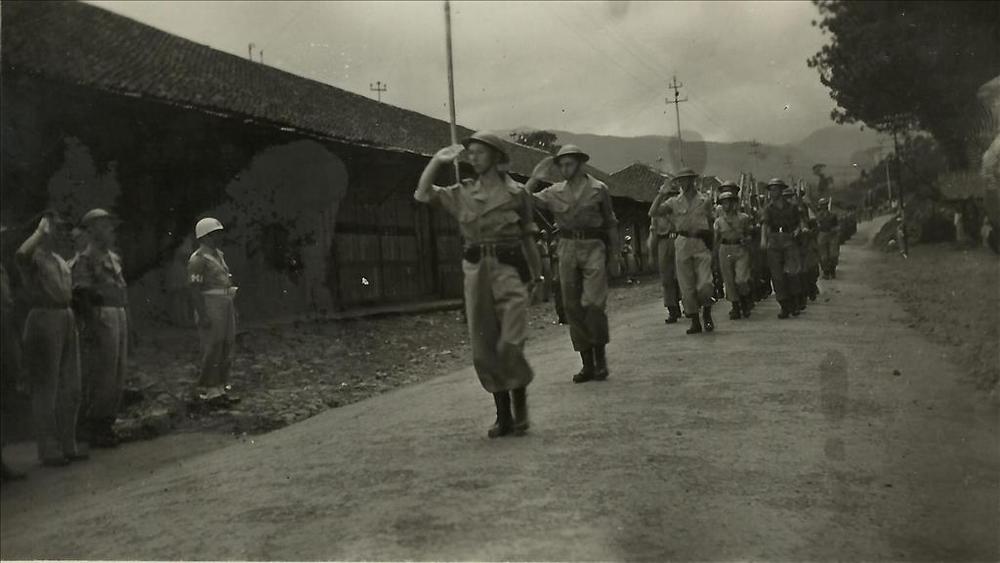 Nederlands Indië; parade, troepen marcheren, groet