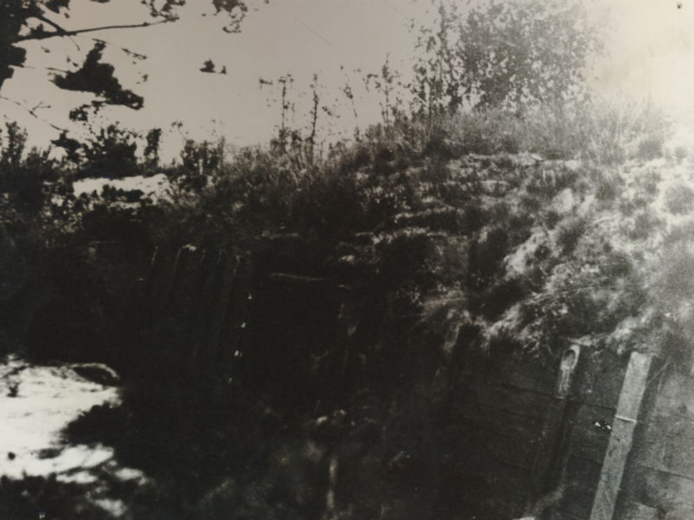 Nederlandse loopgraaf. Tekst achterop: "Bunker Ned. ...