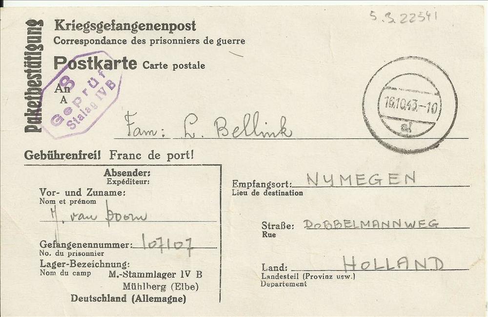 Ansichtkaart Jan P.C. van Doorn uit krijgsgevangensc...