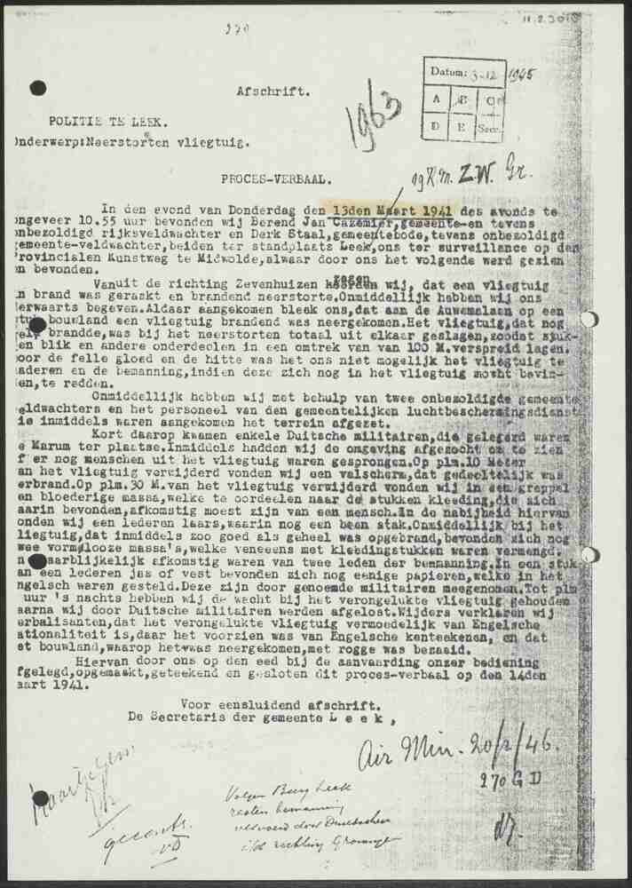 Proces-verbaal, afschrift, Politie te Leek i.v.m. ne...
