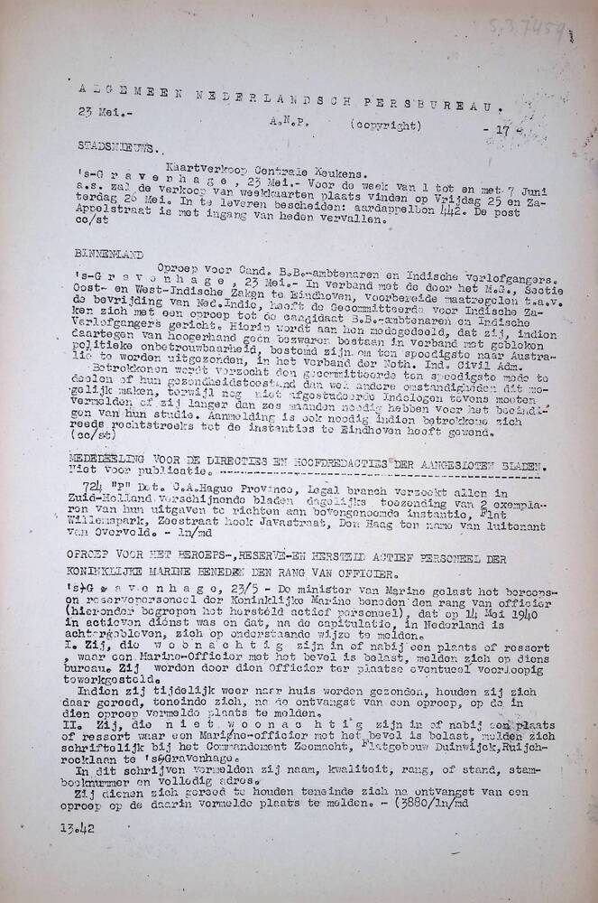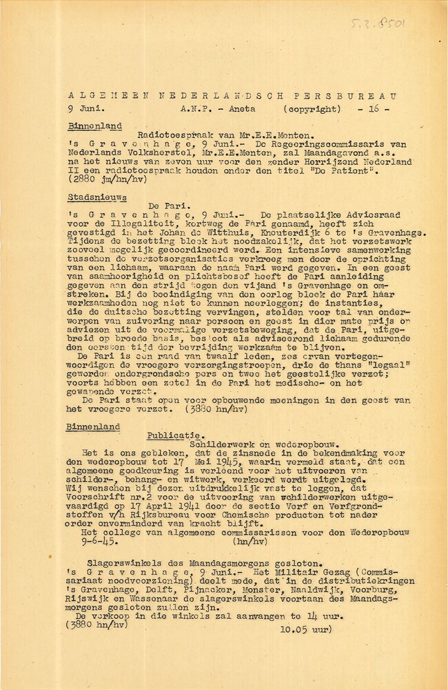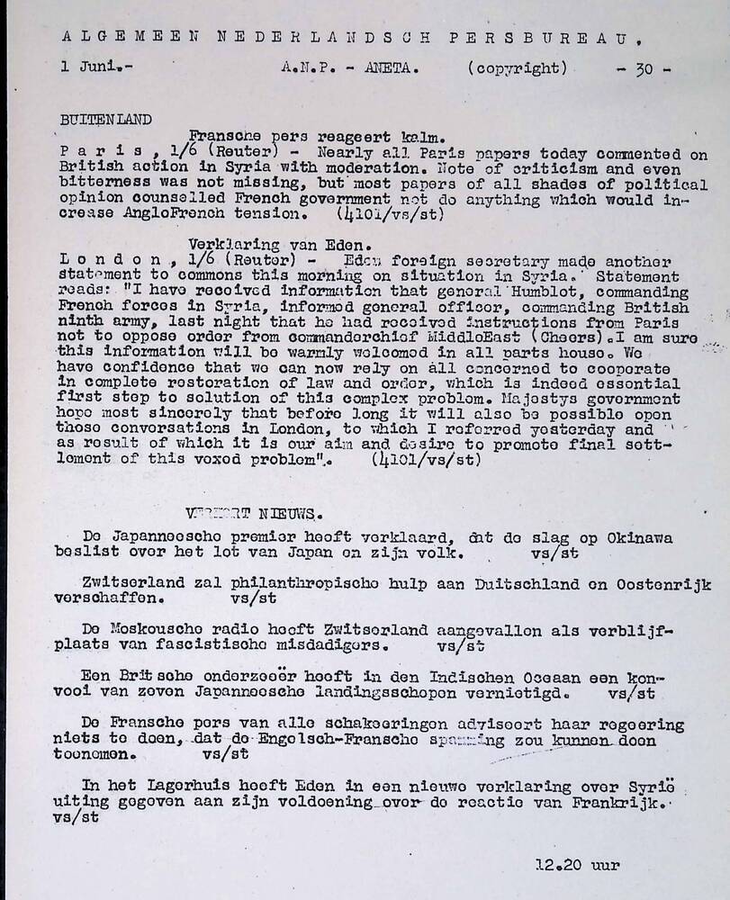 Algemeen Nederlandsch Persbureau, mededelingen, 1 ju...