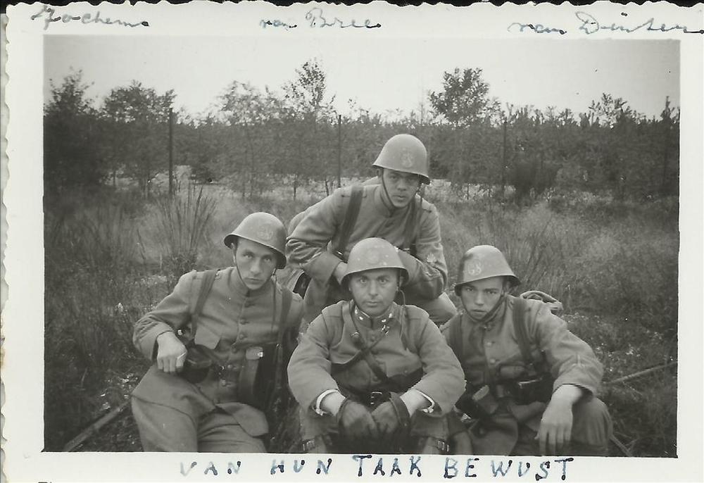 Mobilisatie 1940; vier militairen met helm, op de hei