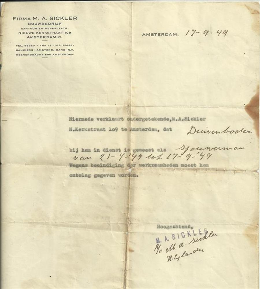 brief van de firma Sickler ( bouwbedrijf ) te Amster...