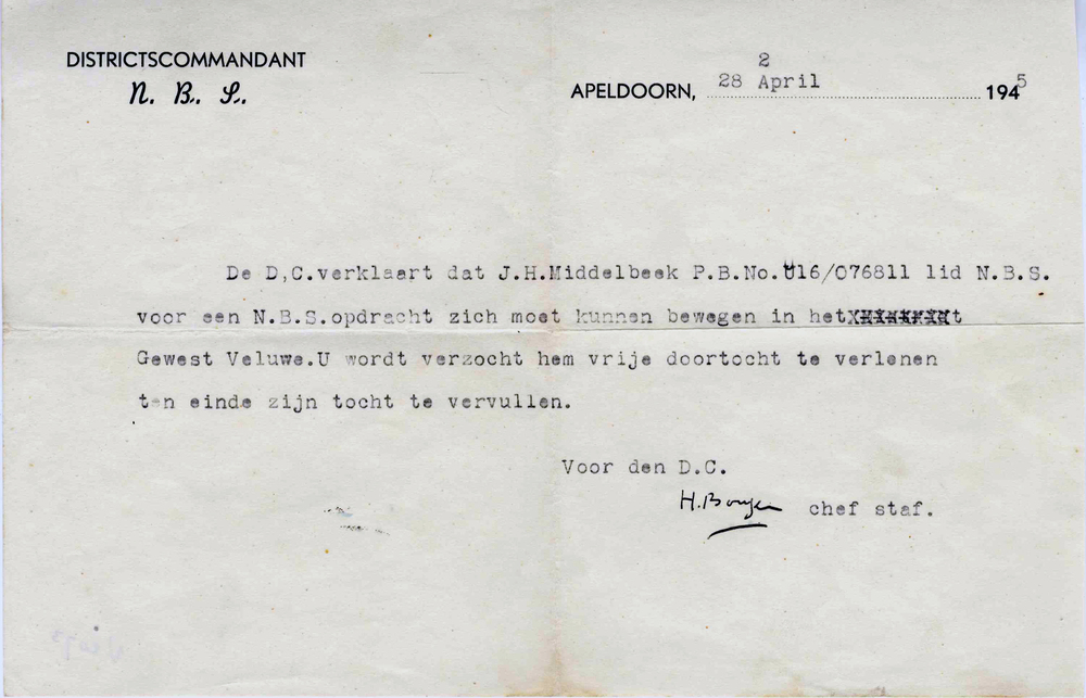Doortochtbewijs op naam van J.H. Middelbeek voor NBS...
