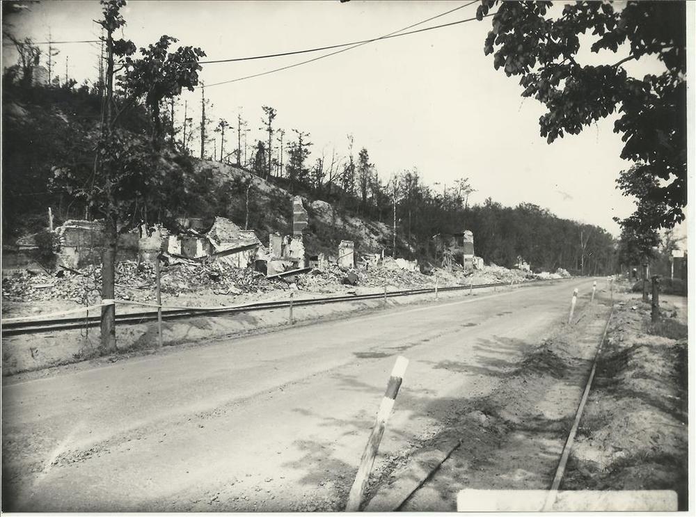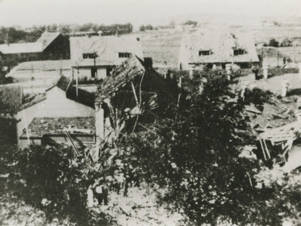 Foto van beschadigde huizen.