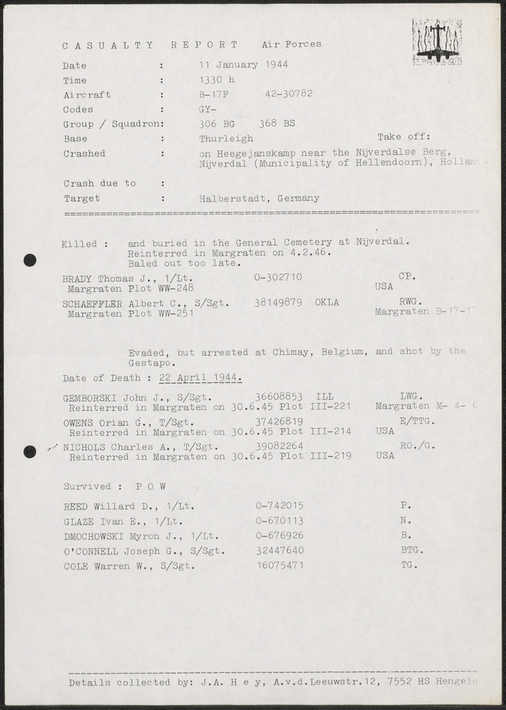 Rapport Luchtbeschermingsdienst Wormer 12 april 1944.