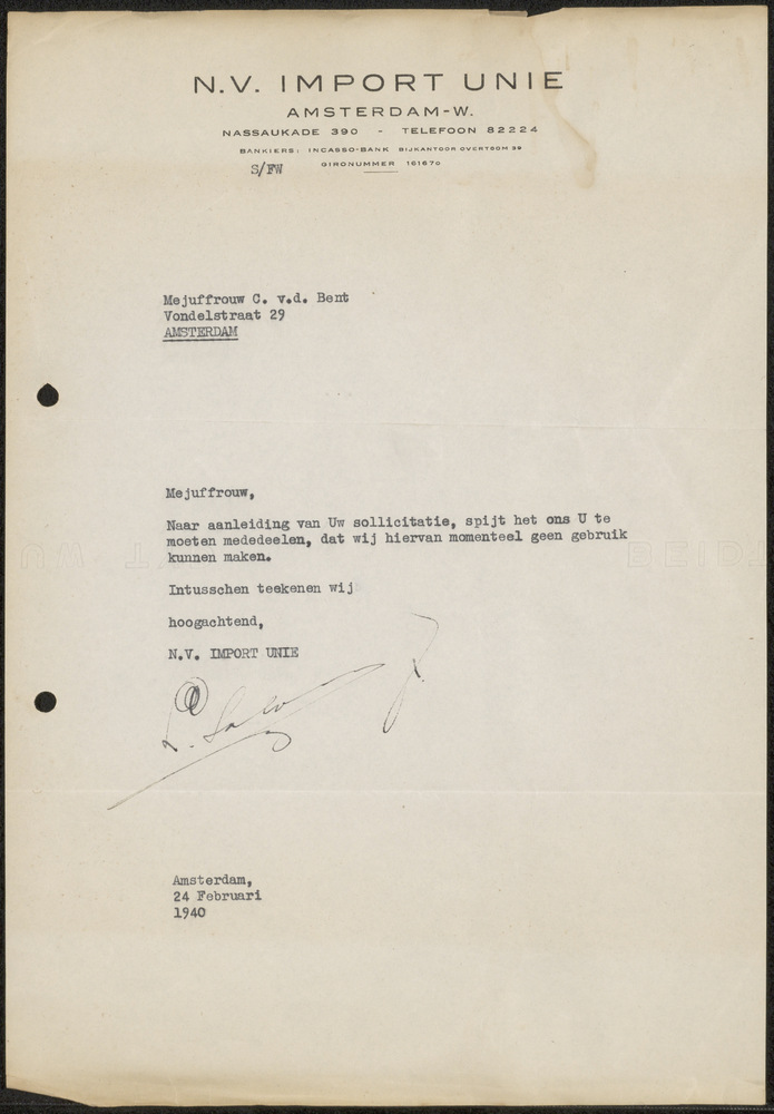Afwijzing sollicitatie van N.V. Import Unie Amsterdam