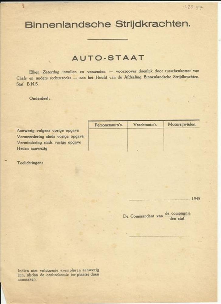 Formulier Binnenlandse Strijdkrachten Auto-Staat, 1945
