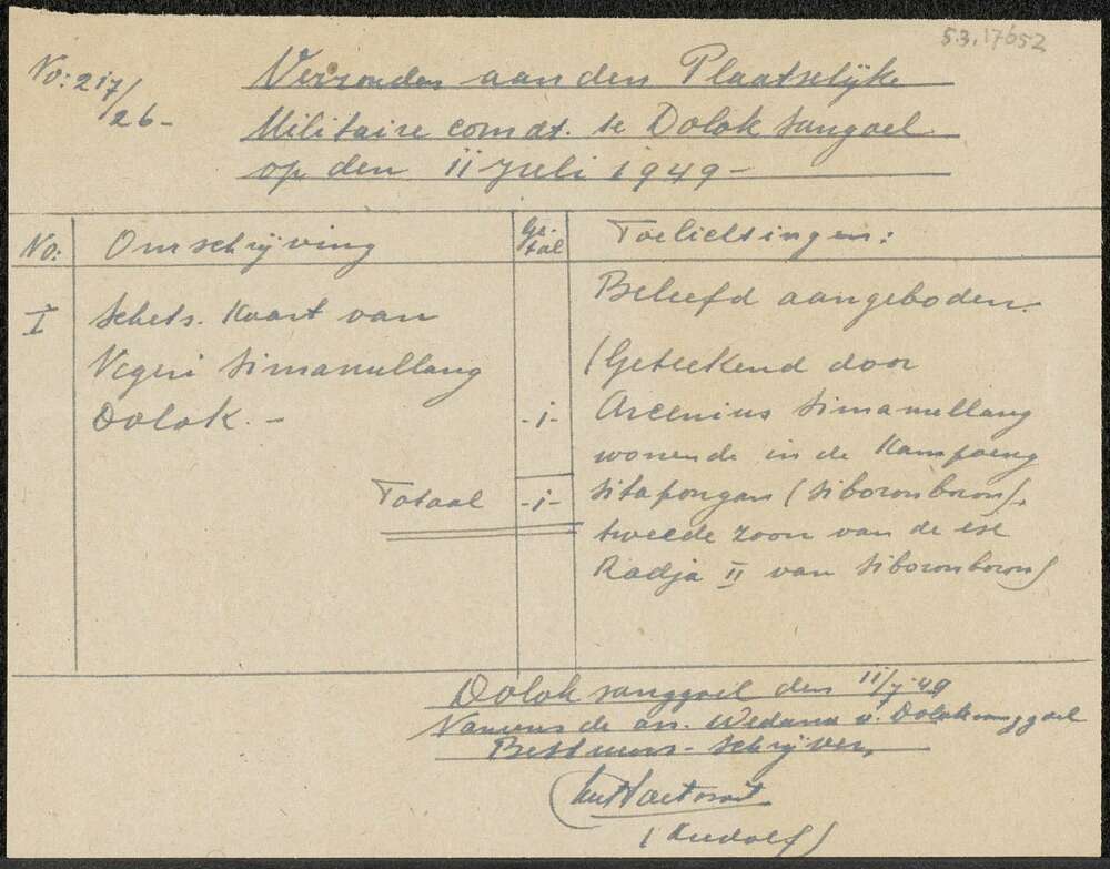 Handgeschreven memo over de Schets kaart Negeri Sima...