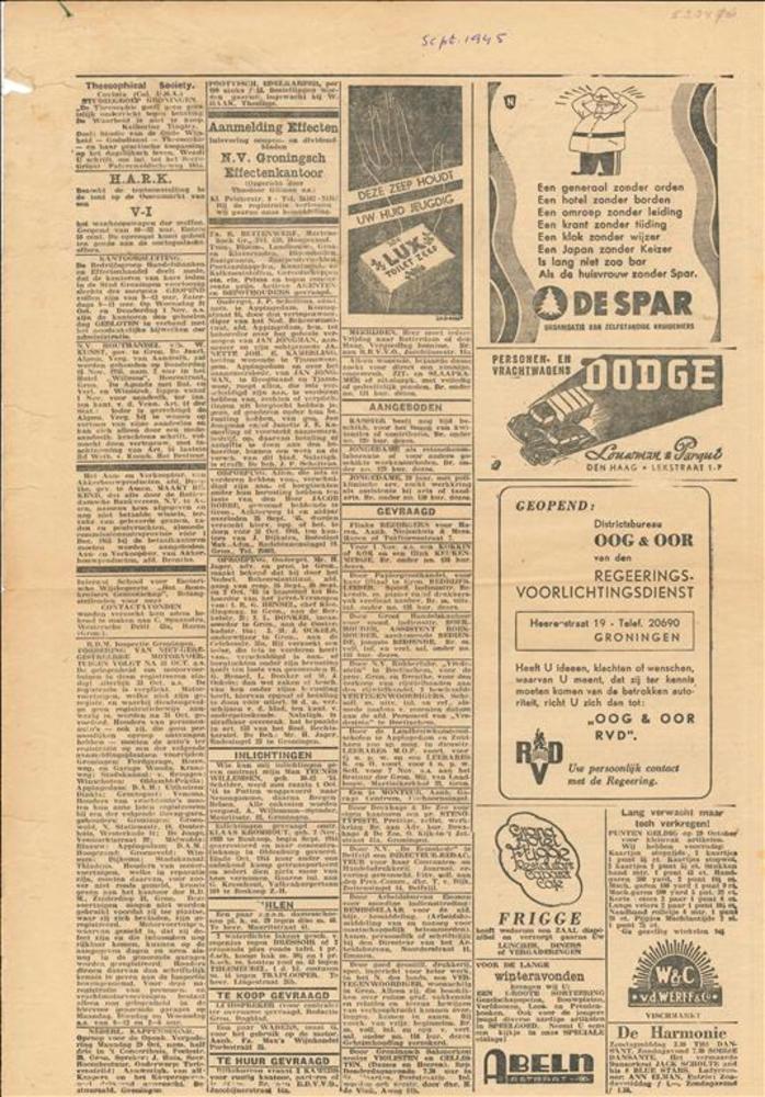 Advertentie-pagina uit een krant van september 1945"