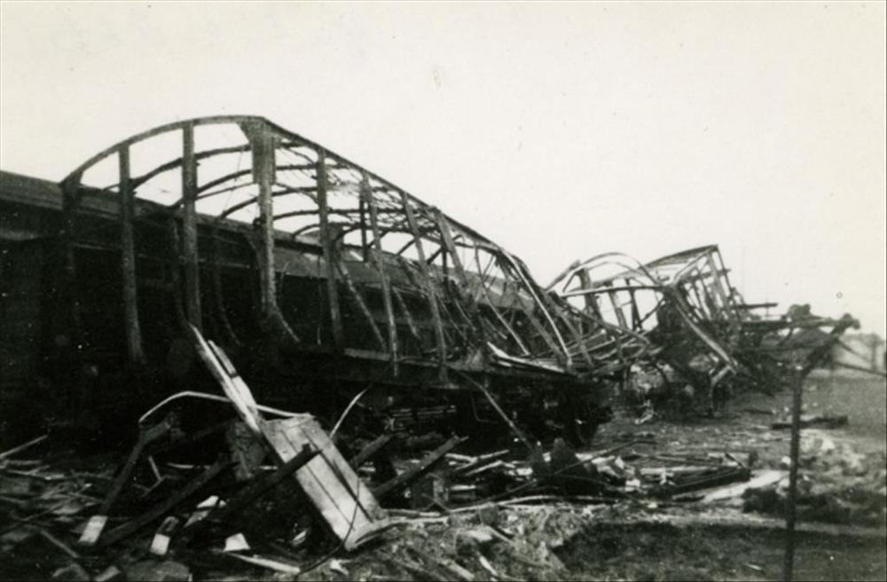 Nijmegen, 22 februari 1944; uitgebrande goederenwagons