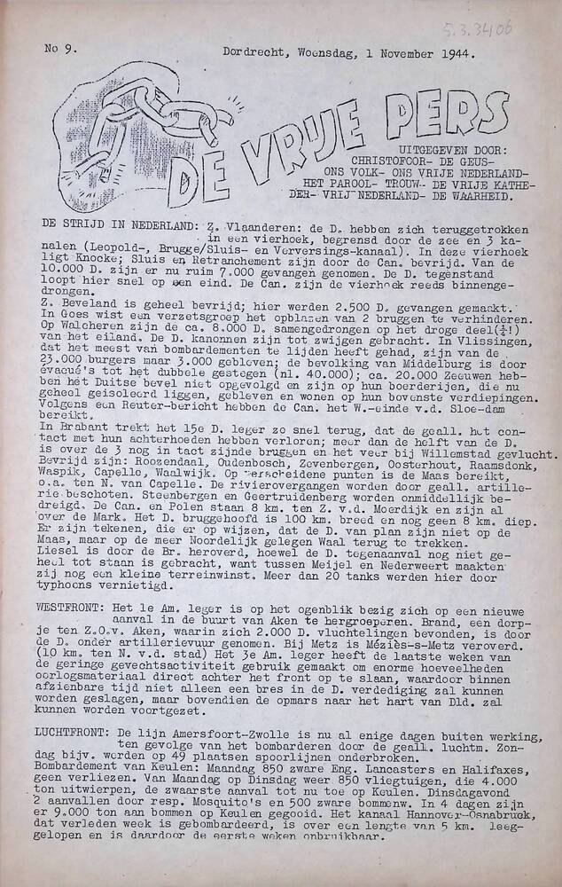 De Vrije Pers ( diverse uitgave ), No. 9, Dordrecht,...