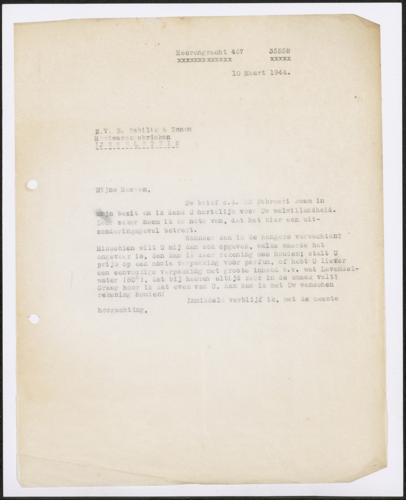 Brief 10 maart 1944 aan N.V. Schilte & Zonen's IJsse...