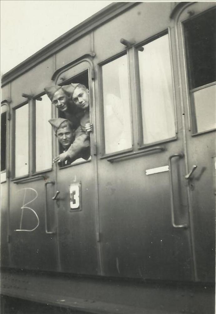 drie nederlandse militairen kijken uit het deurraam ...
