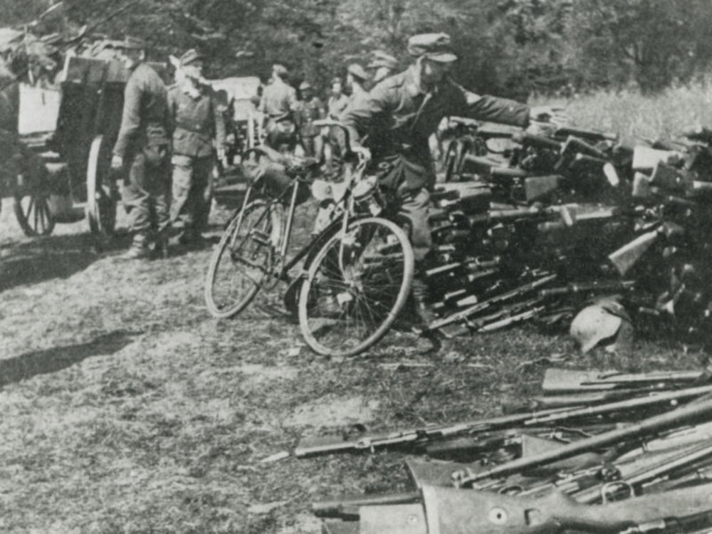 Foto van Duitse militair met fiets in de linkerhand ...