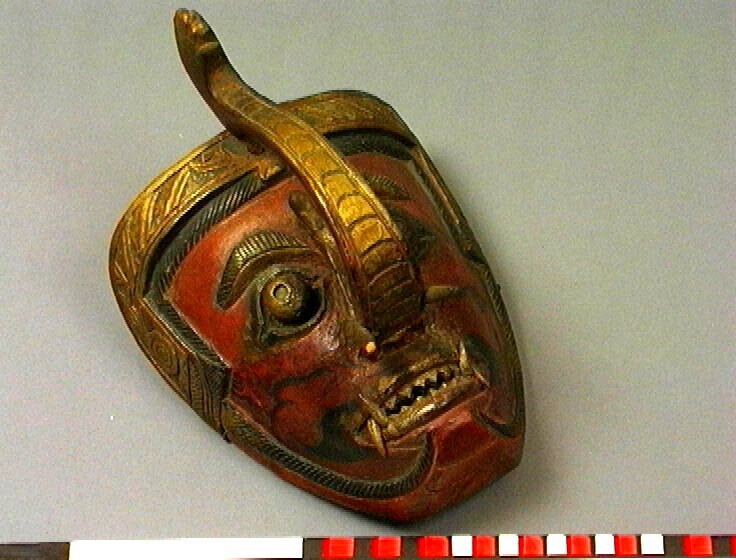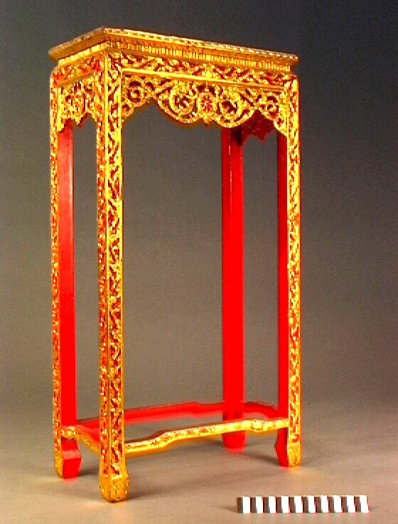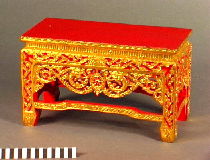 Een rood gelakt altaartafeltje met reliëfversieringen.
