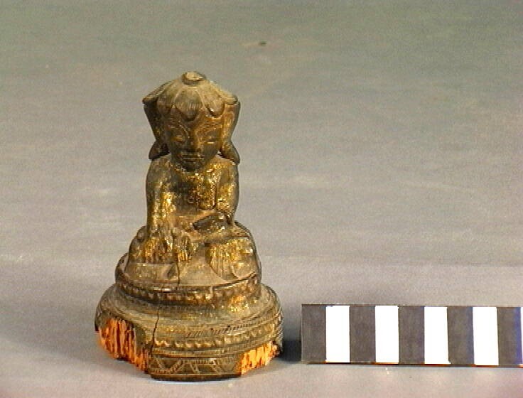 Een goudgelakt houten beeldje van een zittende Boeddha.