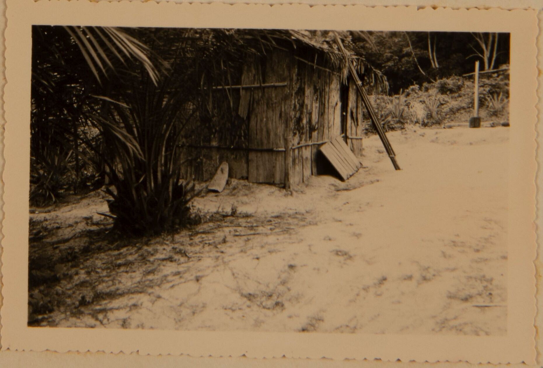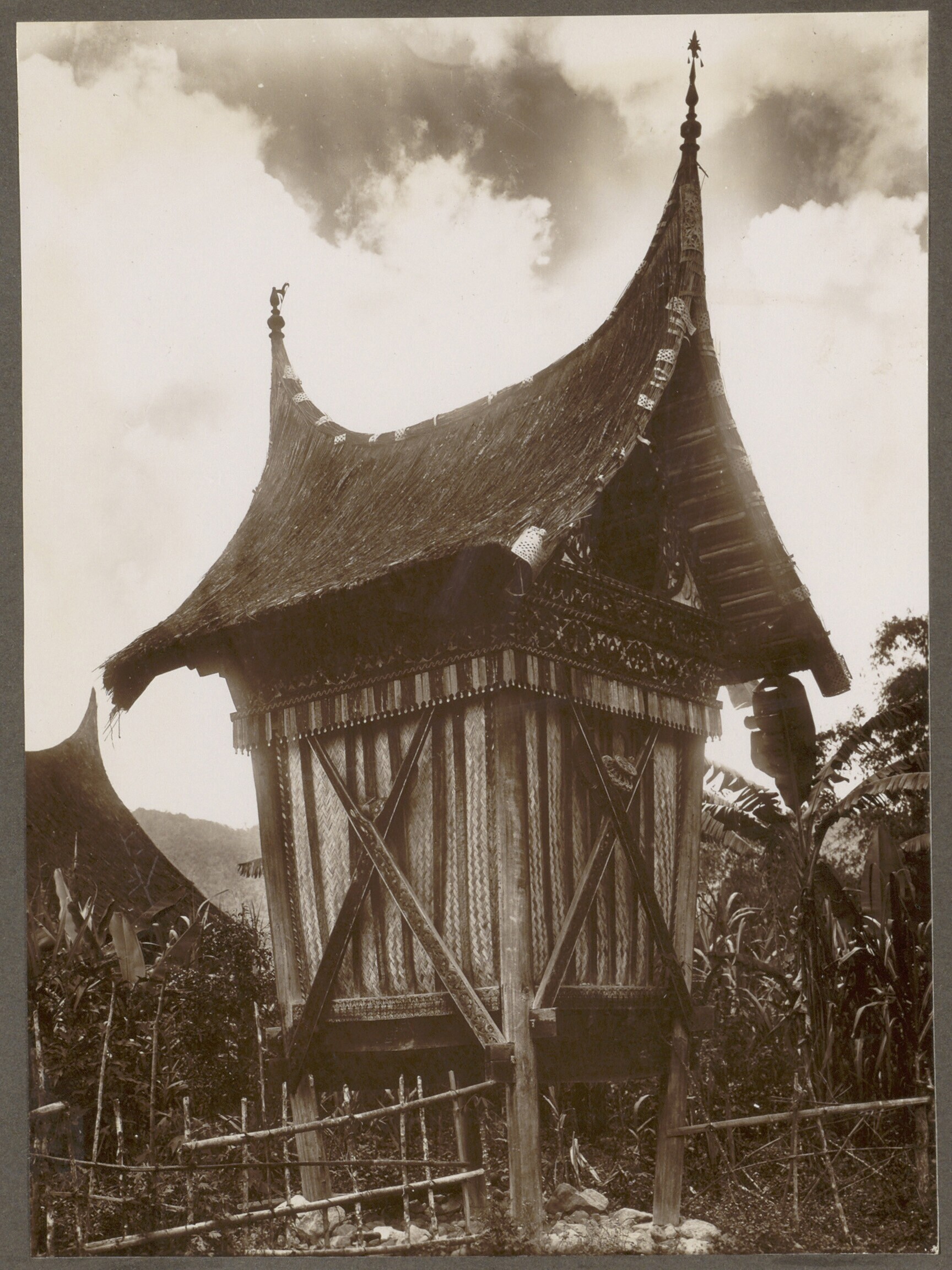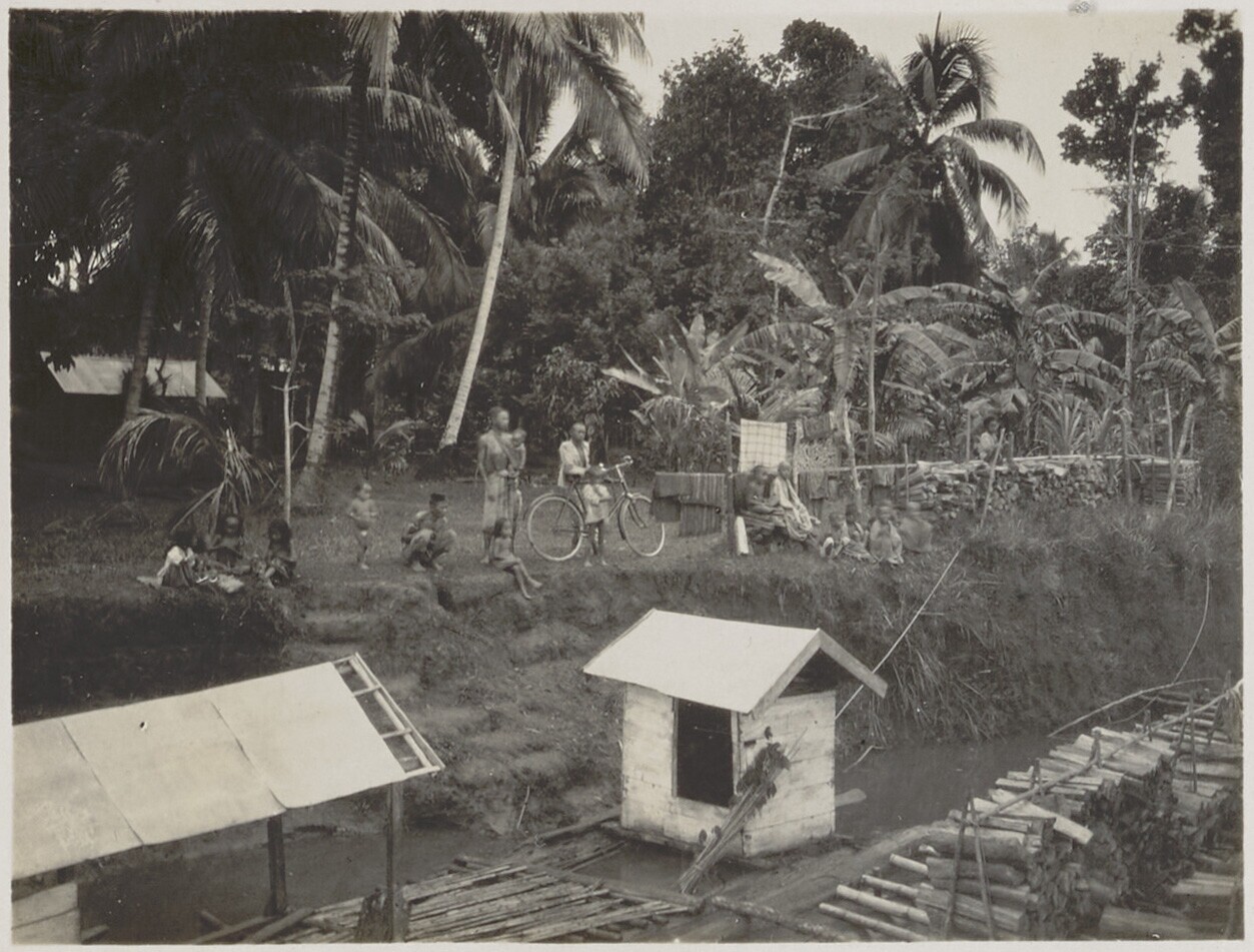 Gambir, Banka. Primitieve houten pers. Het rotanmand...