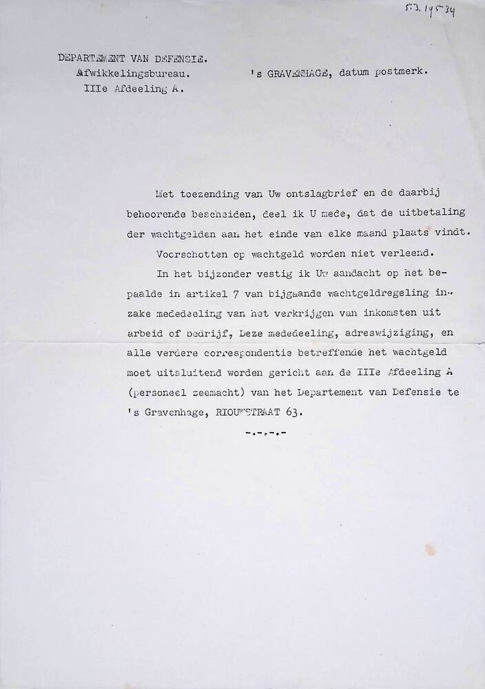 Brief van departement van Defensie bij Ontslagbrief ...