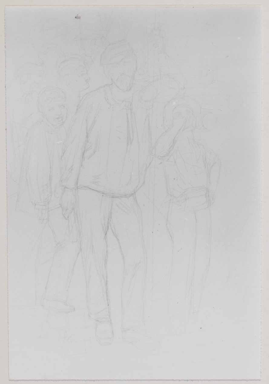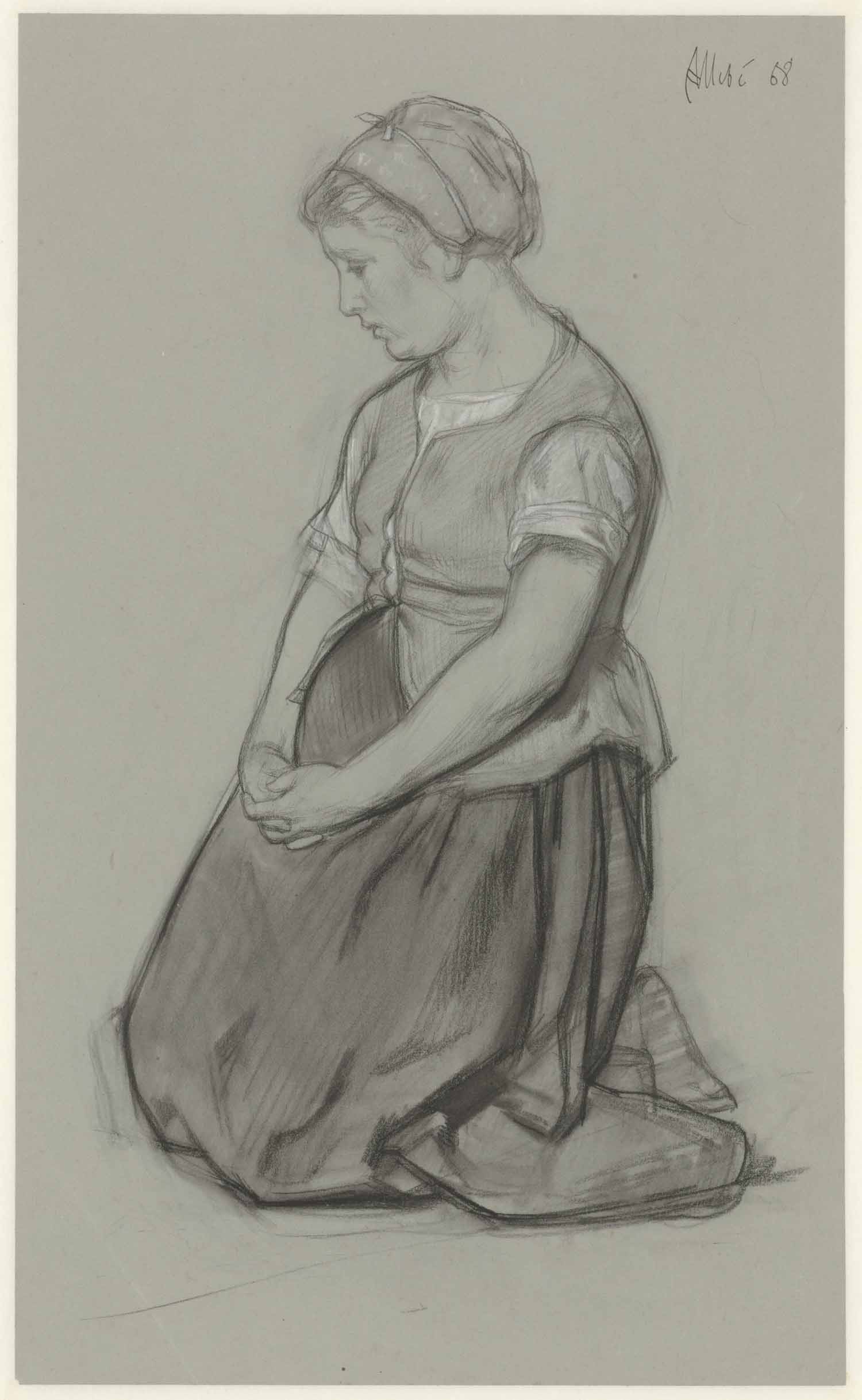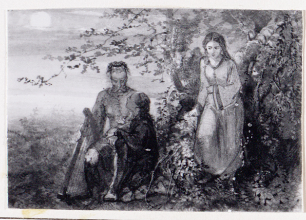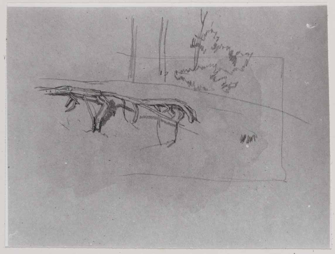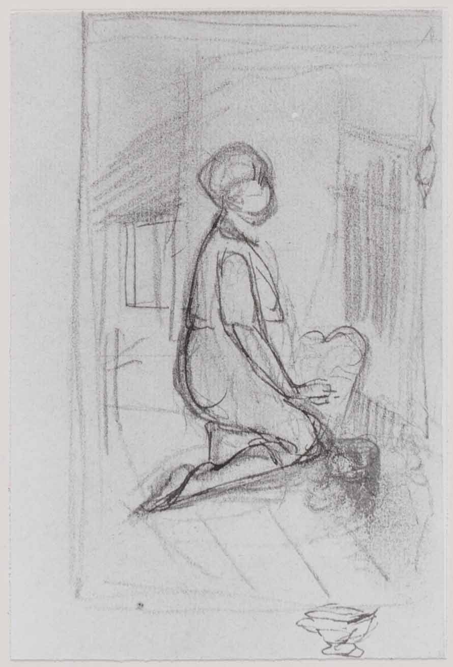 Boven: bosweg; onder: hurkende man en vrouw bij krukje