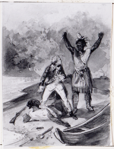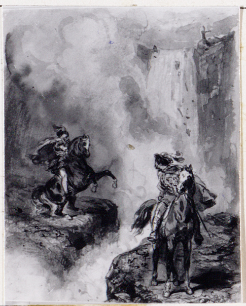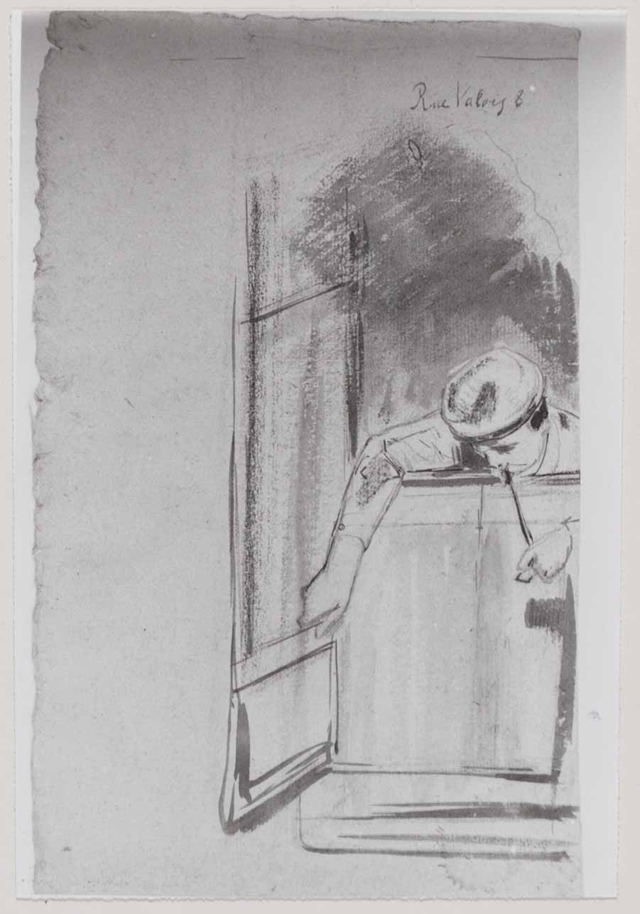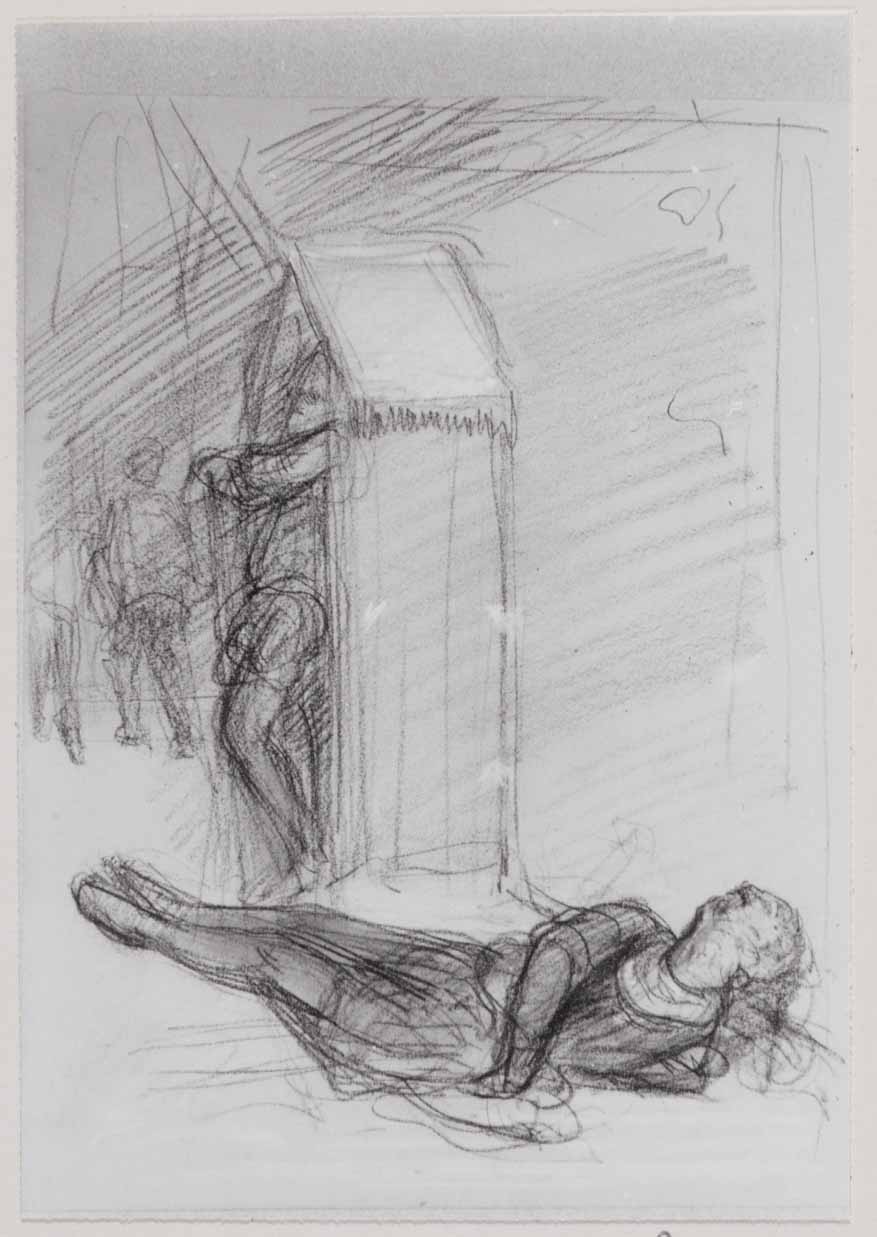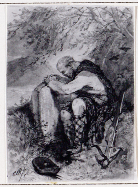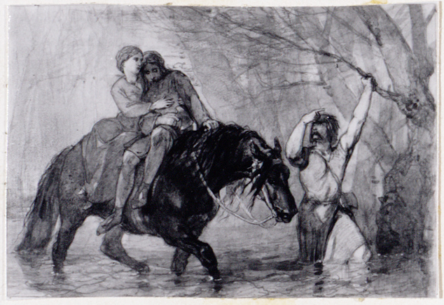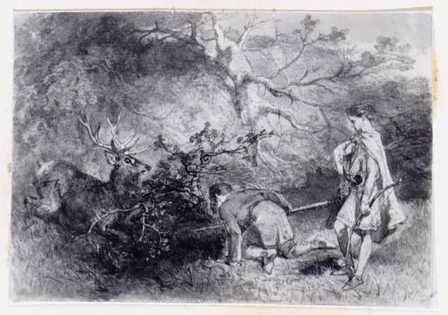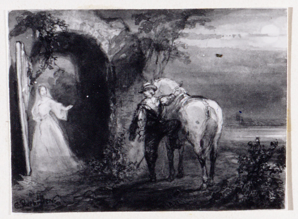 Boven: bosweg; onder: hurkende man en vrouw bij krukje