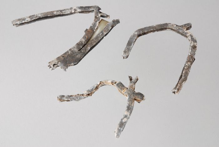 Drie fragmenten van loden montuur van glas-in-lood r...