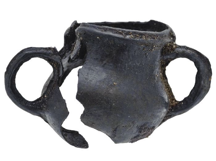 Fragment van tinnen grape met twee staande oren, spe...