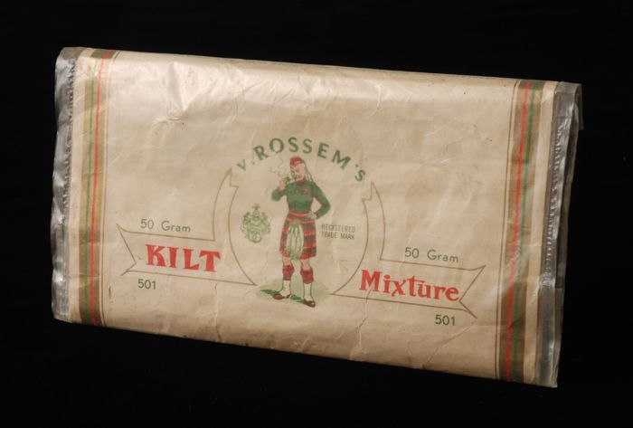 Donkerblauwe verpakking van pakje tabak van Van Ross...