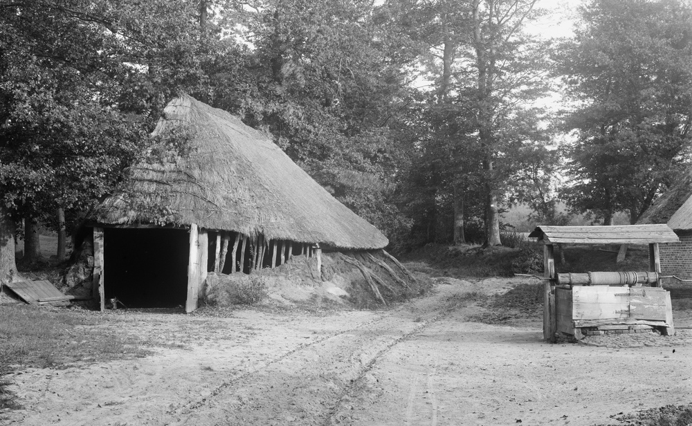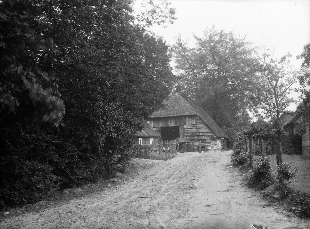 Een Veluwse boer rijdt op boerenkar voortgetrokken d...