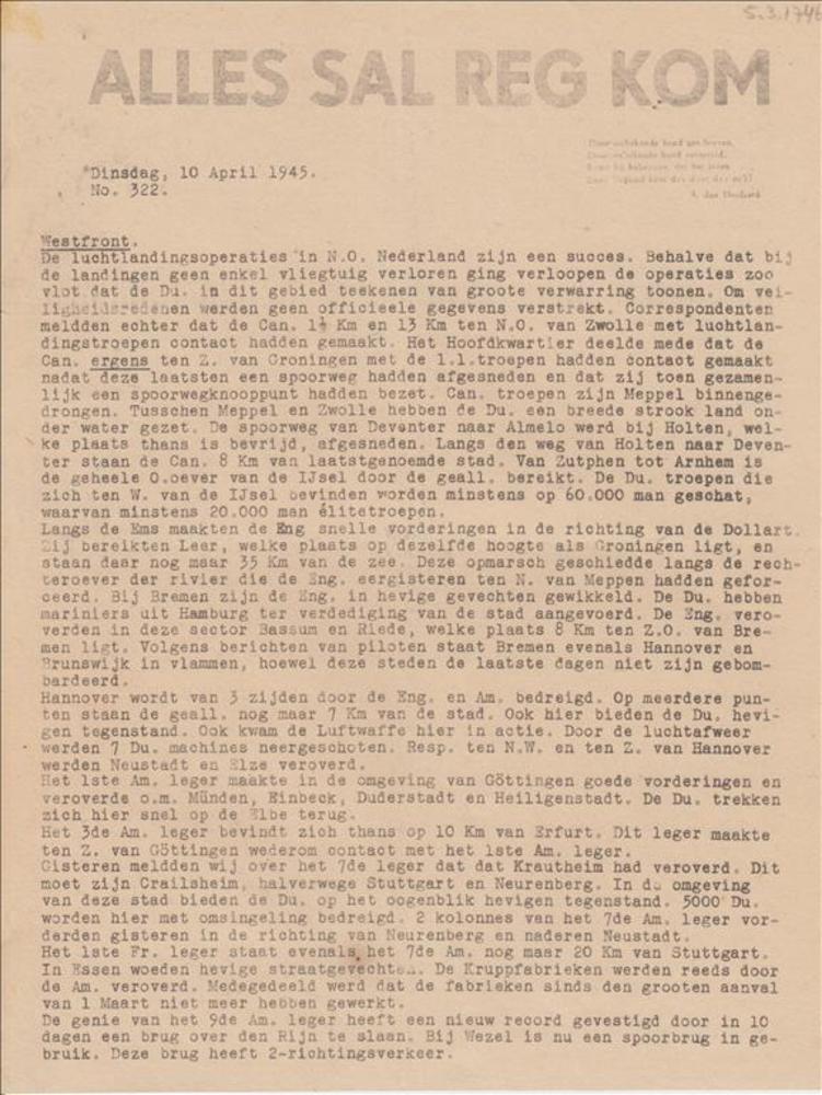 Alles sal reg kom. Dinsdag, 10 April 1945. No 322.