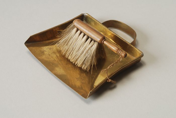 Geelkoperen miniatuur stofblik met houten stoffer, r...