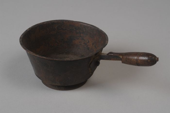 Zwartgeblakerde roodkoperen miniatuur steelpan op vo...