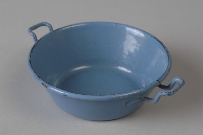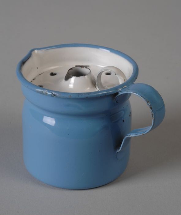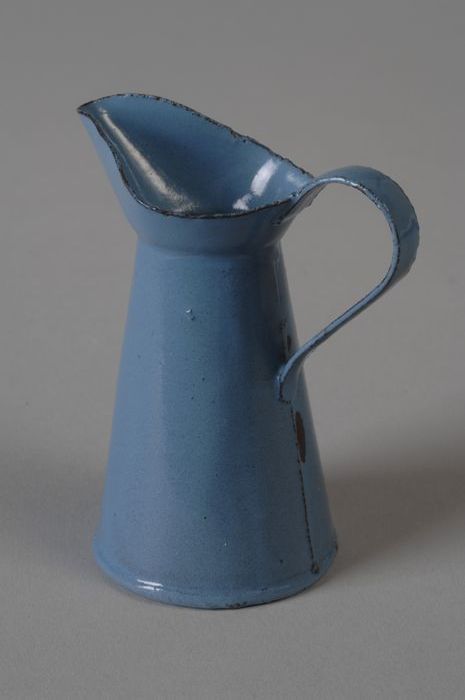 Speelgoed lichtblauw geëmailleerde miniatuur melkkok...