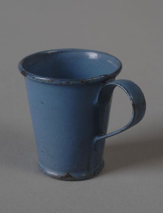 Lichtblauw geëmailleerde miniatuur kroes met oor