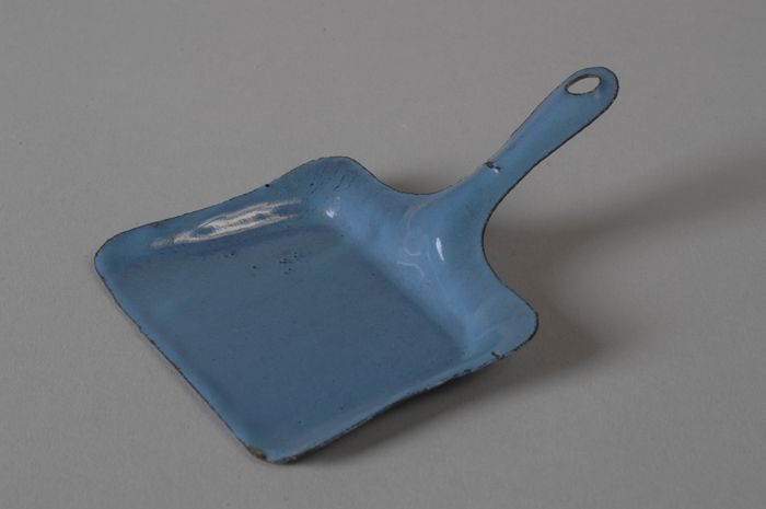 Lichtblauw geëmailleerd miniatuur stofblik met steel...