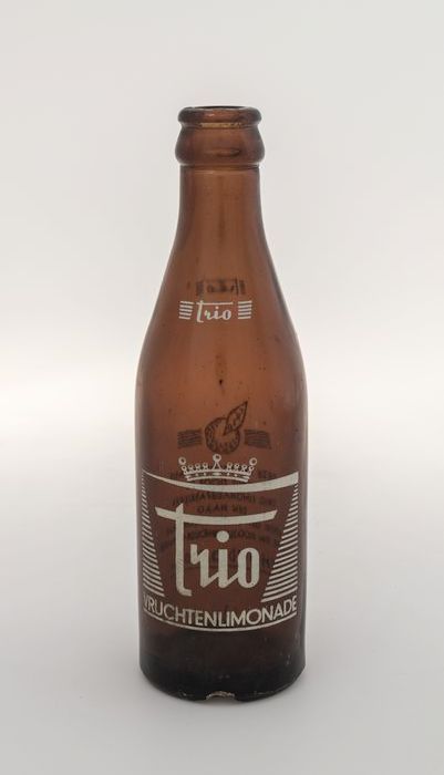 Bruin glazen limonadeflesje met in witte letters "Tr...