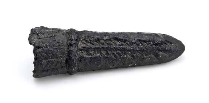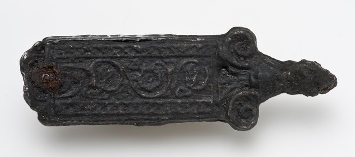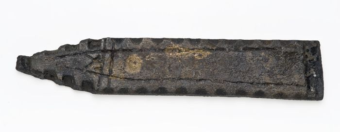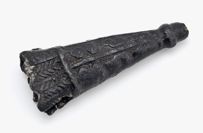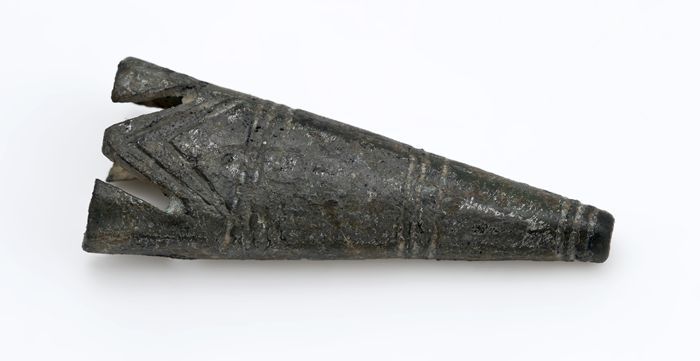 Tinnen punt van messchede of pijlenkoker met versier...