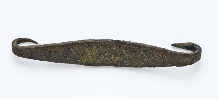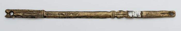 Koperen riemtong, lang en smal, eindigend in een ova...