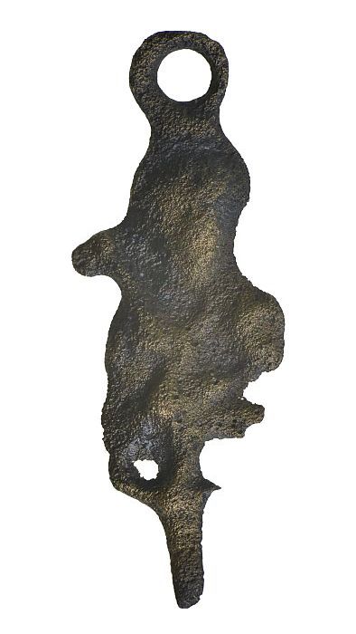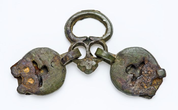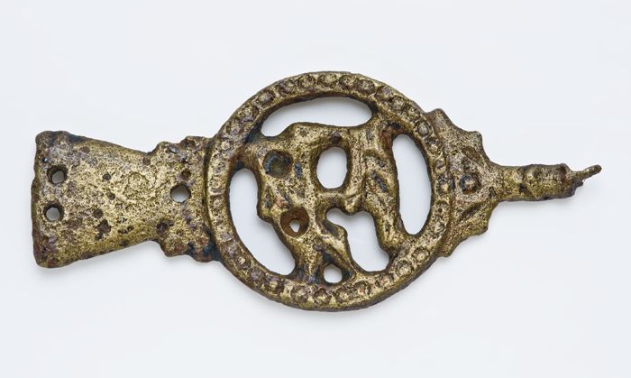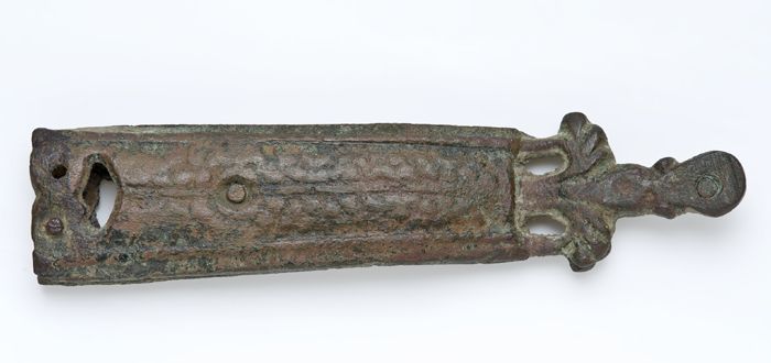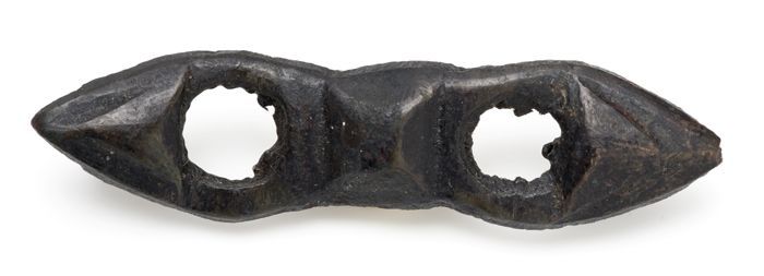 Langwerpig bronzen beslag met twee ronde openingen