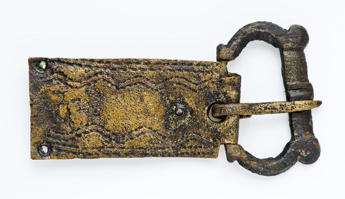 Gesp met D-vormige beugel en angel, met gegraveerd b...