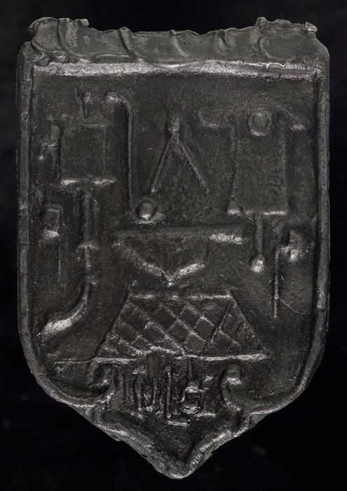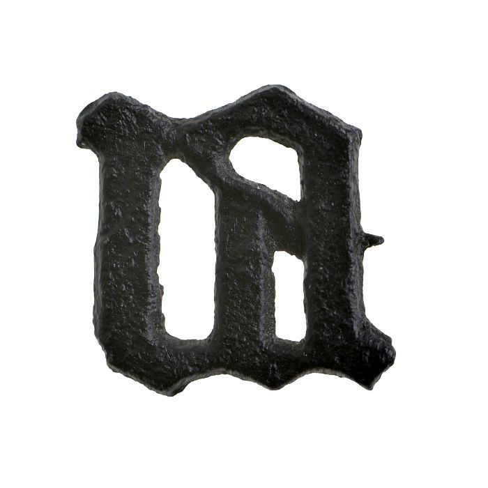 Tinnen insigne (of beslag) in vorm van letter "M"