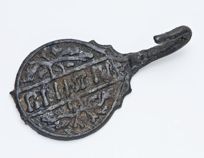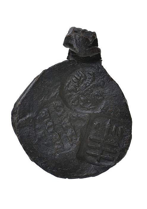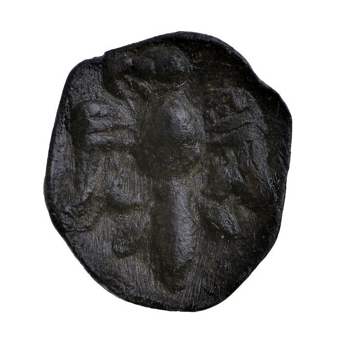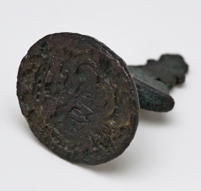 Bronzen zegelstempel, op onderzijde voorstelling in ...