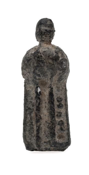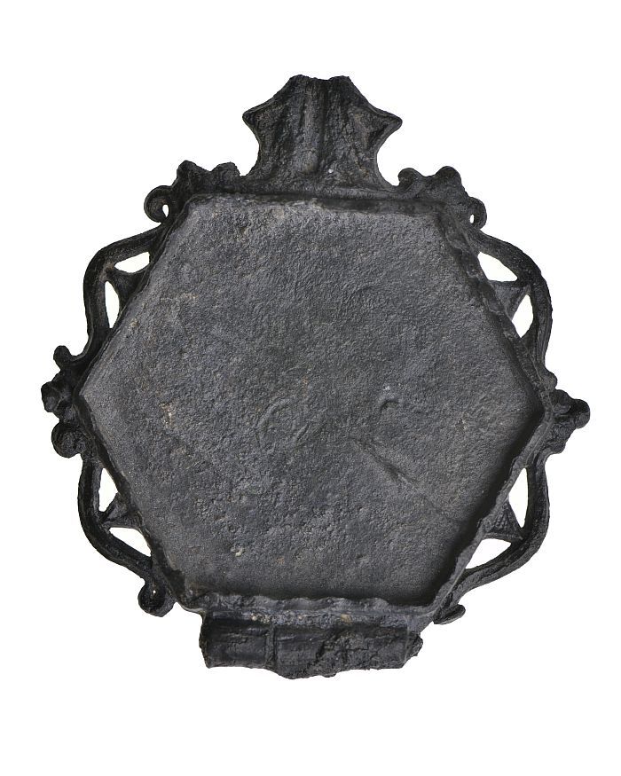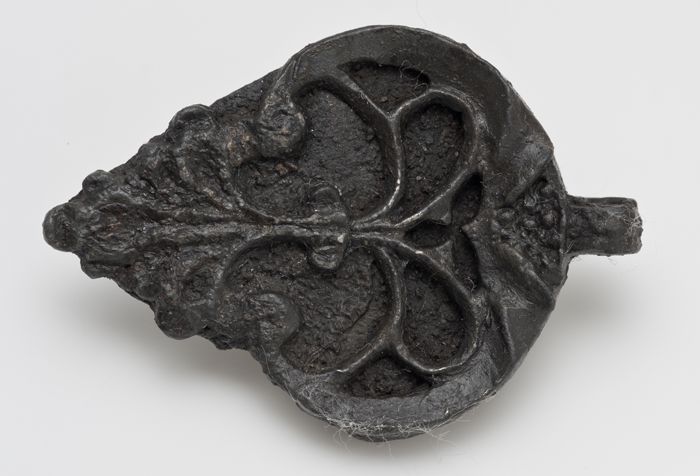 Gedeelte van tinnen leerbeslag of klein beeld