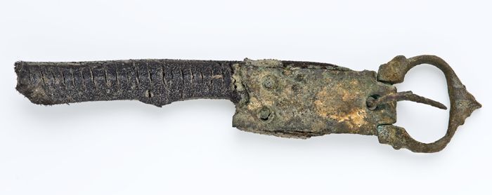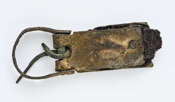 Gesp met angel, beslag en restant leren riem, scharn...