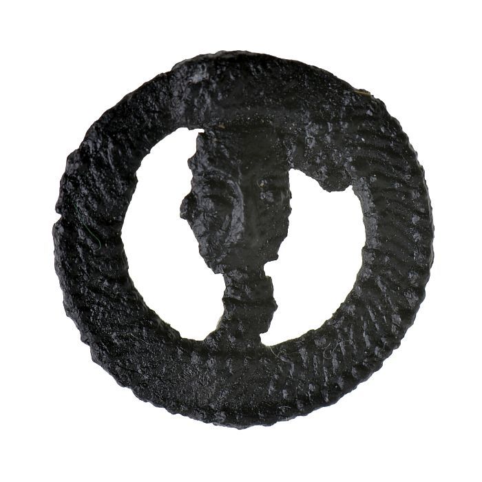 Riemtong met ronde versierde schijf, eindigend in ee...